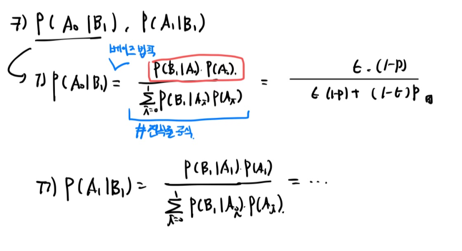 - 베이즈 법칙 # 조건부 확률의 조건 순서를 뒤바꾼다. # 분모에는 전확률 공식이 들어간다.
