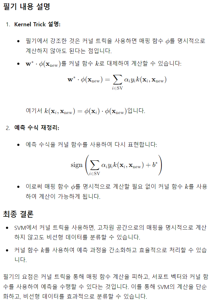 위에서 Kernel Trick를을 사용하여 복잡한 내적 계산을 하지 않고 SVM을 고차원(Kernel Space)에서 훈련시킬 수 있었다.