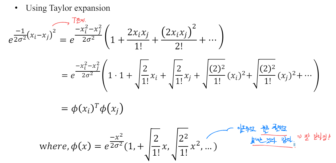 특히 RBF는 Taylor 전개를 통해 이론적으로 무한 차원으로 보냄을 보일 수 있다.