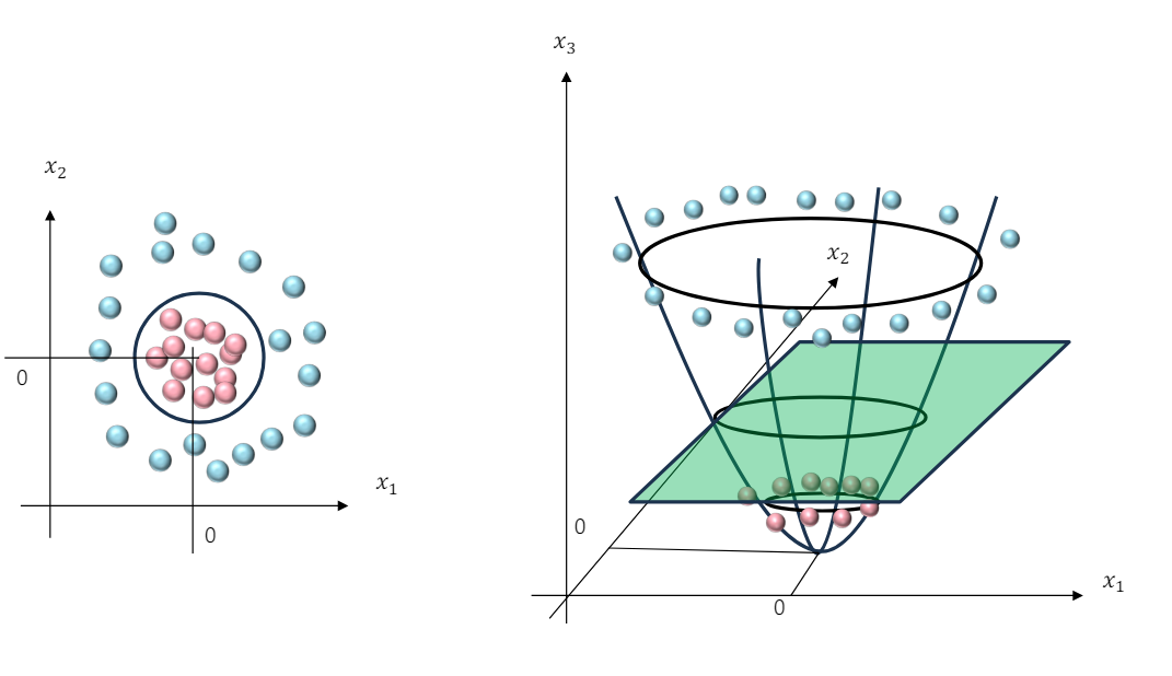 이 맵핑 함수를 사용하여 기존의 데이터를 고차원에 적절하게 배치하면, 선형 경계로 나눌 수 있을 것이다.
