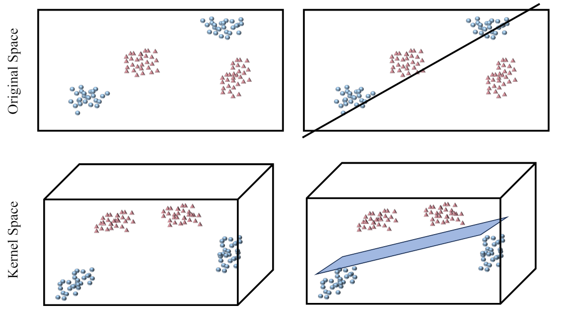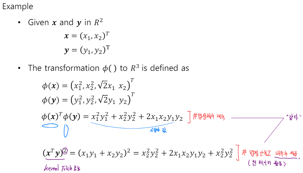 고차원 Kernel space는 관측치 분류가 더 쉬울 수 있고, Kernel space를 효율적으로 계산할 수 있는 방법(Kernel Trick)이 존재하기 때문에 우리는 SVM을 기존의 공간이 아닌, Kernel space에서 학습할 것이다. ***