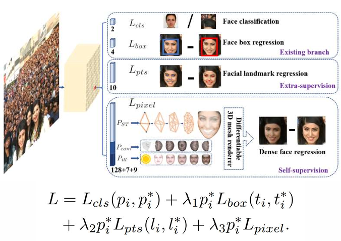 주요 포인트는 얼굴을 인식하기 위한 다양한 Task에 대한 각각의 로스를 정의하고, 모든 Task를 한 번에 학습시키는 Multi-task learning을 적용한 것이다. 이를 통해 Face Detection 성능을 향상시켰다.