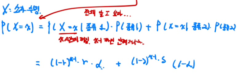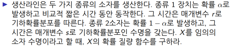 종류 1일 때의 확률 질량 함수는 (소자가 죽는)성공 확률이 r인 기하 분포의 확률질량함수이다. 종류 2일 때는 (소자가 죽는)성공 확률이 s인 기하 분포의 확률질량함수이다. 이게 그냥 주어진거다.