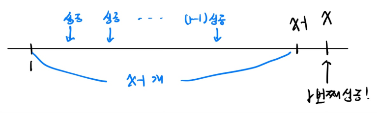 r번의 성공을 위해 x번 시도했을 때, 마지막 순서는 무조건 성공이어야한다. 이제 남은 자리 x-1개 중 r-1 성공 자리를 배정하고, 확률을 곱해주면 된다. x가 총 시행횟수임을 잊지말자.