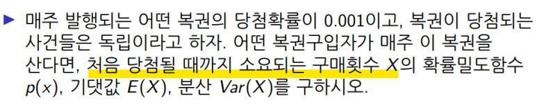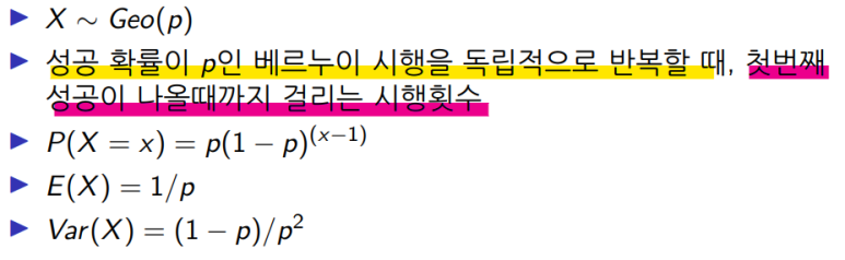 기하 분포의 확률 변수X는 독립 베르누이 시행의 '첫 성공까지의 시행 횟수'이다. 헷갈리지 말자.