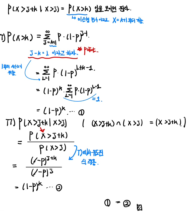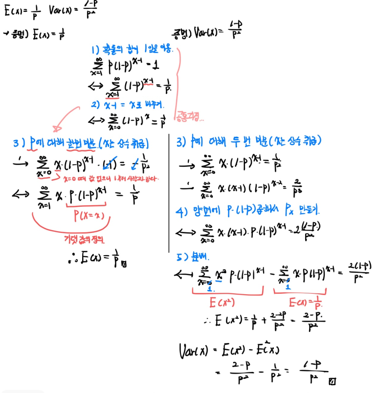 - # 기하 분포의 기댓값, 분산 증명 ***증명*** 어렵다 과정을 잘 기억하자. 자주 회독하자.