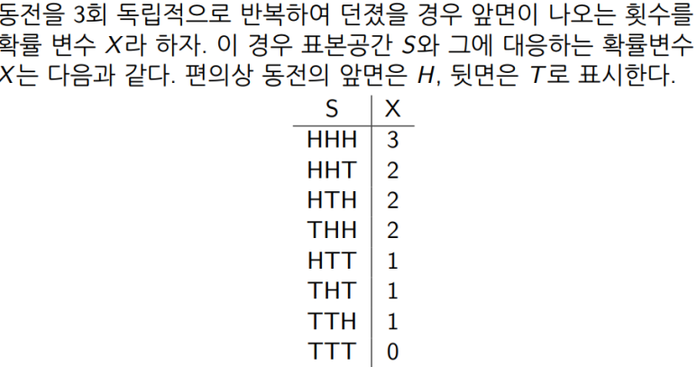위 예시를 보자. 동전이 앞면이 3번 나온 경우는 X = 3으로 맵핑 (HHH)