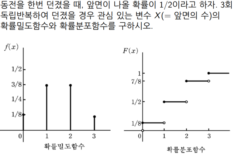 뒤에서 매우 매우 자주 쓰므로, 잘 알아두자. 확률 분포 함수는 누적 분포 함수라고도 부르는데, 확률 변수 X가 주어진 점 x 이하인 모든 값을 가질 확률을 누적한다는 점에서 그렇다.