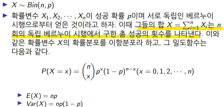 이항 분포 X는 독립 베르누이 시행에서 구한 총 성공 횟수.