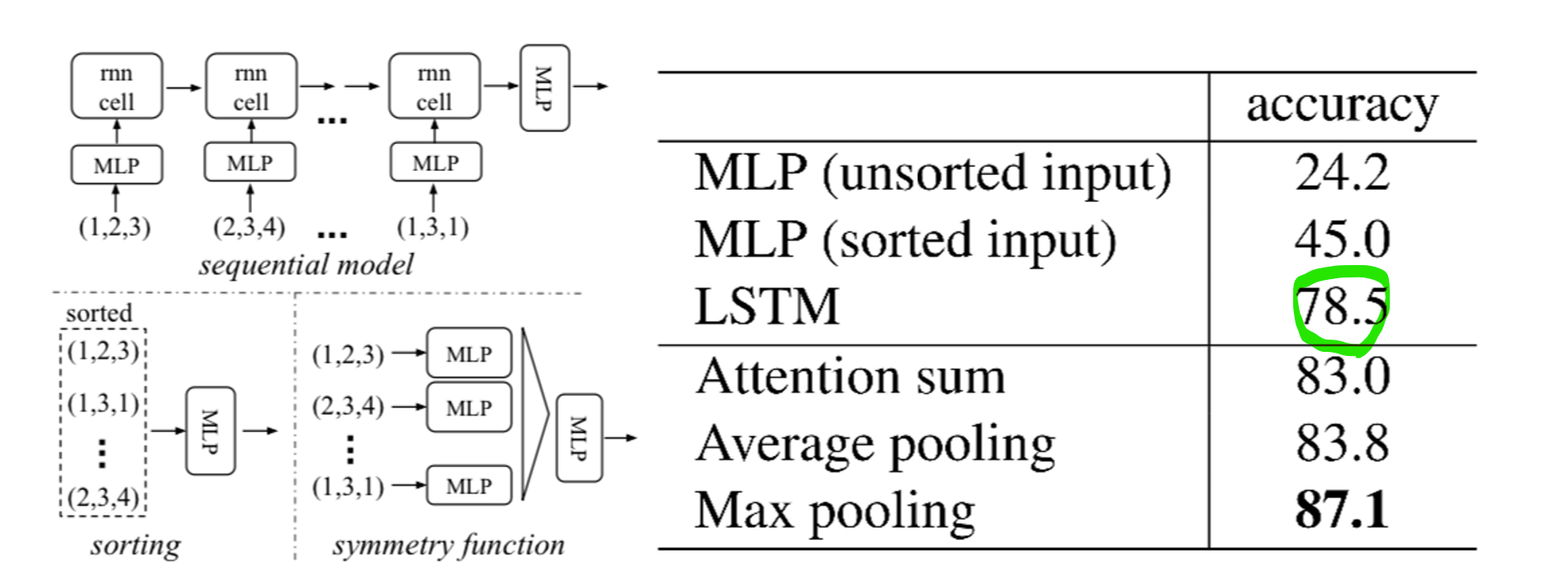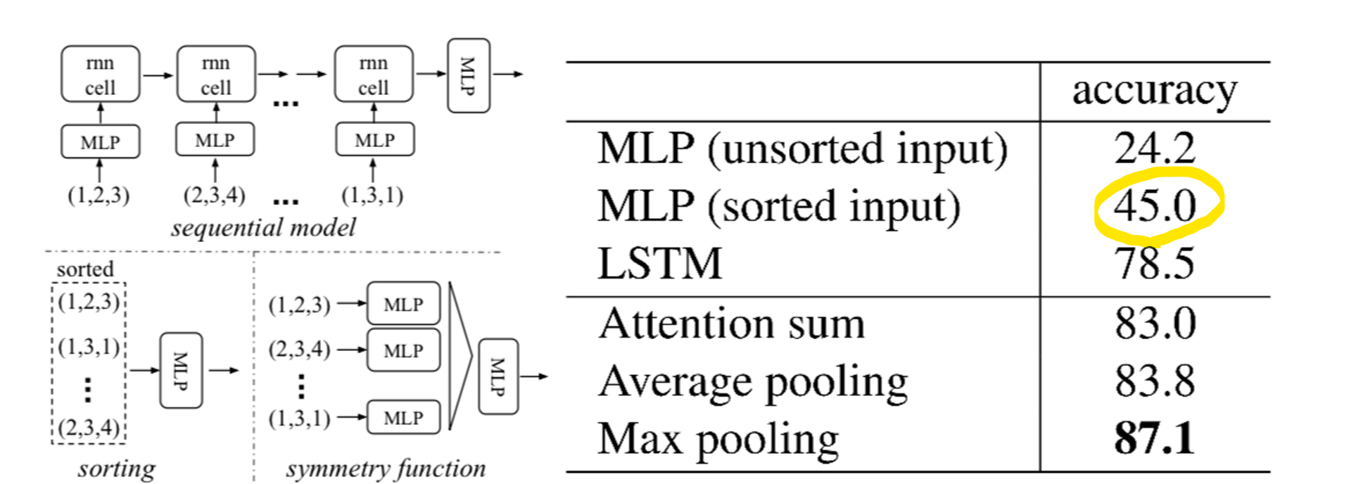 짧은 길이의 입력에 대해서는 순서에 불변한 출력 값 도출이 상대적으로 잘 되었으나, 매우 많은 양의 입력이 들어오면 순서의 영향을 받았다. 앞서 계속 말했듯이 point cloud는 Permutation invariance 특성을 가지므로 input data들을 어떤 순서로 받든지 output에는 영향을 끼치지 않아야 한다.