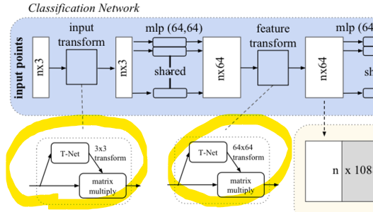 PointNet은 Transform을 위한 작은 크기의 T-Net을 제안한다. affine transformation matrix 통해 추정, 이를 입력에 적용하여 transform한다. 쉽게 말하면 기존에는 input을 직접 정렬을 했다면, T-Net을 통해 정렬한다는 것이다.이를 통해 서로 다른 크기의 입력 point cloud를 feature를 한 번 정렬해줄 수 있으며, 불변성에 강한 output을 만들 수 있다.