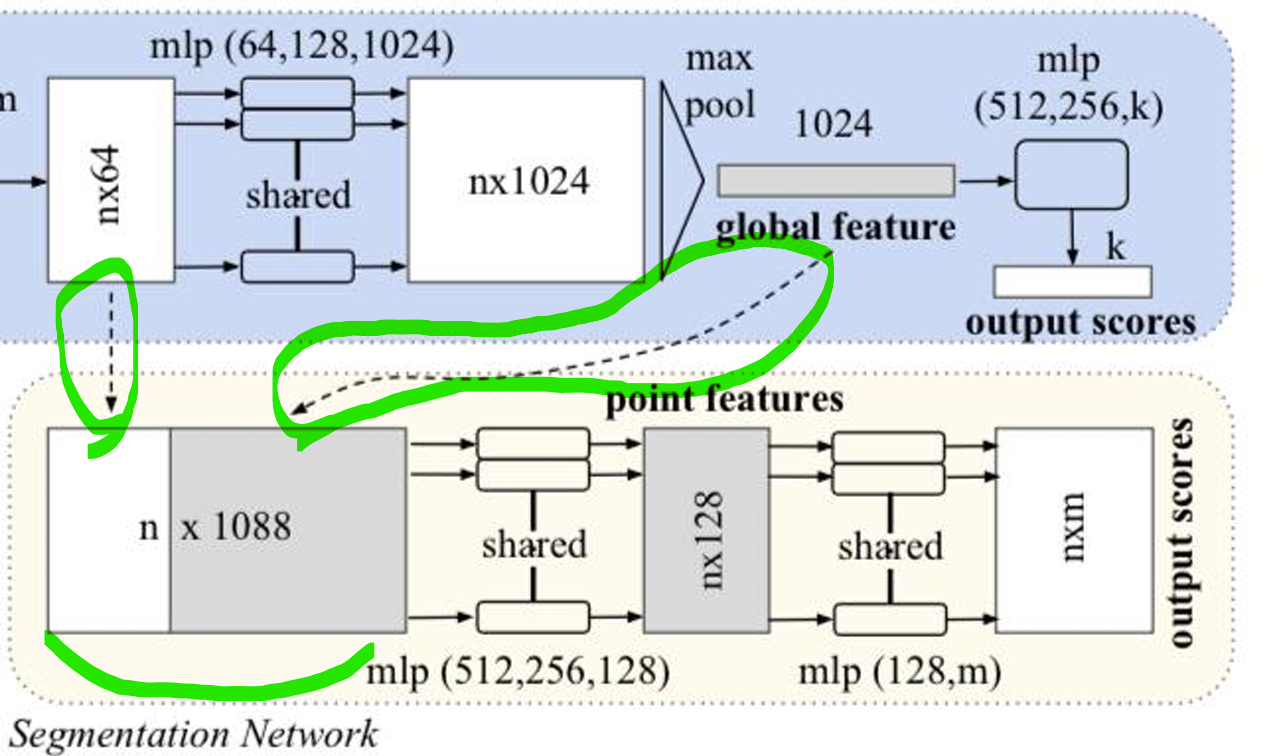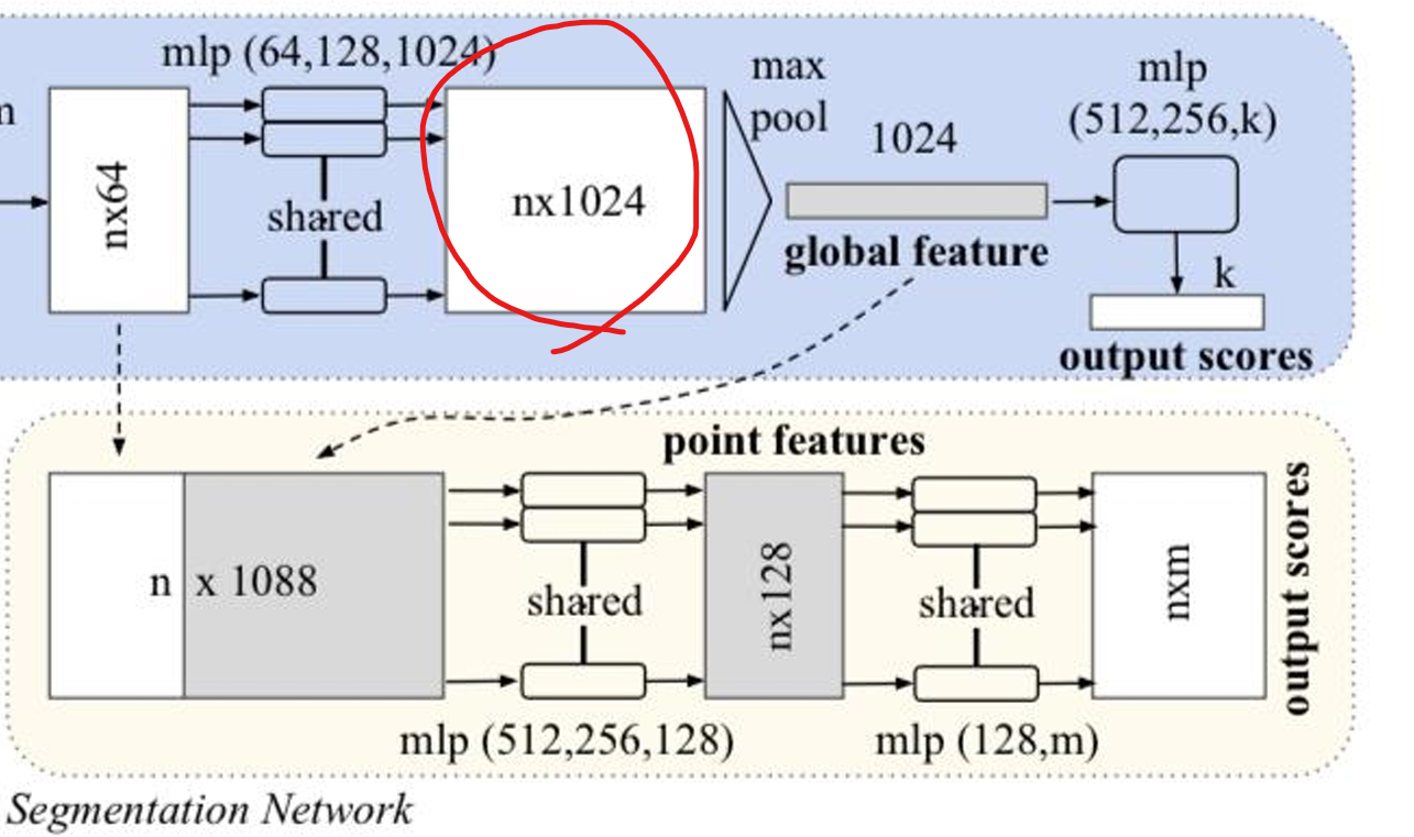 중간 layer의 입력값인 nx64에 global feature vector인 1 x 1024를 concatnate한다. 이를 통해 PointNet이 Segmentation 까지 가능해진다. nxm output scores는 m개의 각 클래스에 대한 스코어를 나타낸다.