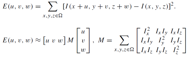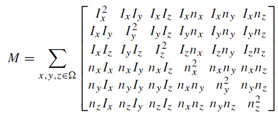 기본적인 Error function이 3차원으로 늘어나 복잡하니 그대로 계산하지 않고 공분산 행렬 M을 정의한 후, 1차 근사하여 Harris Corner 3D 해를 구한다. 해를 구한다.