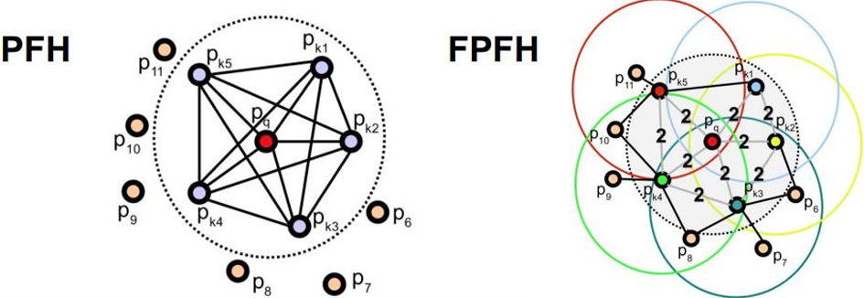 FPFH는 PFH의 속도 문제를 해결하기 위해 개발된 방법이다. 직접적으로 연결된 pair에 대해서만 계산을 한다. PFH와 마찬가지로 포인트 클라우드 내에서 포인트 간의 기하학적 관계를 분석하지만, 더 간단한 방식으로 특징 벡터를 생성해 계산 효율을 높였다.