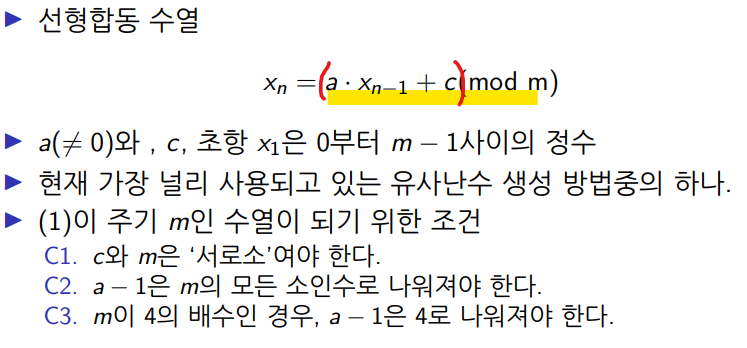 음 다음 항에 전 항 선형변환의 m으로 나머진 나머지를.. 이렇게 하면 난수가 유사 난수가 나온다.