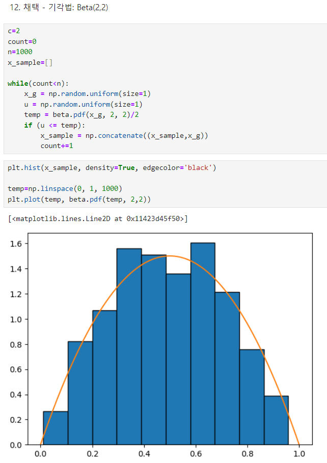 3) 만약 u <= f(xi)/cg(xi)라면 xi를 fx의 표본으로 채택/ u> f(xi)/cg(xi) 이면 기각.
