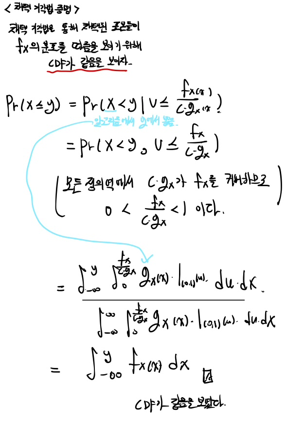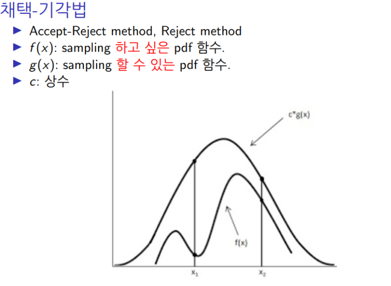 fx 즉 pdf를 알지만 E(X), Var(X)를 구하기엔 식이 너무 복잡하고, 샘플링 또한 어려울 때, 샘플링할 수 있는 다른 pdf gx를 통해 fx의 표본을 채택한다. 이걸 채택- 기각법이라고 한다.