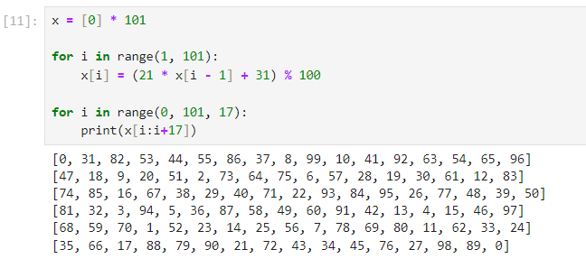 나누는 m값이 주기와 나타내는 수를 정한다. 위 예제에서 m = 100이었으므로 초기값 0부터 99(m-1)가 주기 100을 따라 나타난다.
