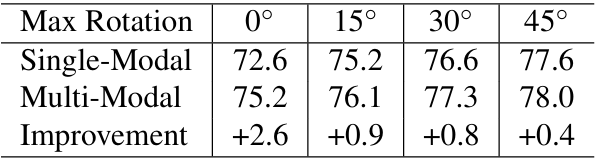 데이터 증강이 커질 수록, Single-Modal과의 성능 차이가 없다... 데이터 증강인 회전 각도가 커질수록 카메라와 LiDAR 데이터를 융합한 효과가 감소하는 것이다. 이러한 실험을 바탕으로 정렬이 정확하지 않으면 카메라 입력의 이점이 미미해진다는 결론을 보인다.