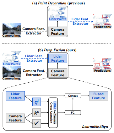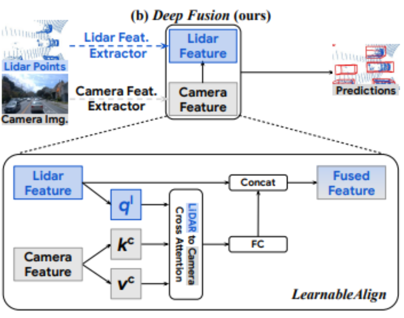 하지만, feature들은 종종 augmentation되거나 aggregation된다. 그렇기에 두 feature를 효과적으로 정렬하는 것이 가장 큰 도전 과제이다. 본 논문에서는 이를 위해 회전과 같은 geometric-related augmentations를 되돌리는 1) InverseAug 그리고 융합 과정에서 이미지와 라이더 feature 사이의 correlation을 동적으로 포착하기 위해 cross-attention을 사용하는 2) LearnableAlign 두가지 새로운 기술을 제안한다.