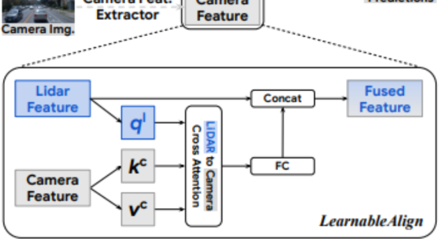 LiDAR 특징과 가장 관련 있는 카메라 특징을 더 잘 정렬하기 위해, 논문는 두 모달리티 간의 상관관계를 동적으로 포착하는 교차 주의 메커니즘을 사용하는 LearnableAlign을 도입한다. cross-attention을 사용하여 두 모달리티 간의 상관관계를 동적으로 계산한다.