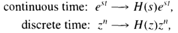 cf. 연속 및 이산시간에 대하여 LTI 시스템의 입력이 복소지수의 선형결합으로 표현된다면, 출력 또한 같은 복소지수신호의 선형 결합으로 표현될 수 있다는 것이다. 이래서 아웃풋 신호 예측이 쉽다는 것이다.