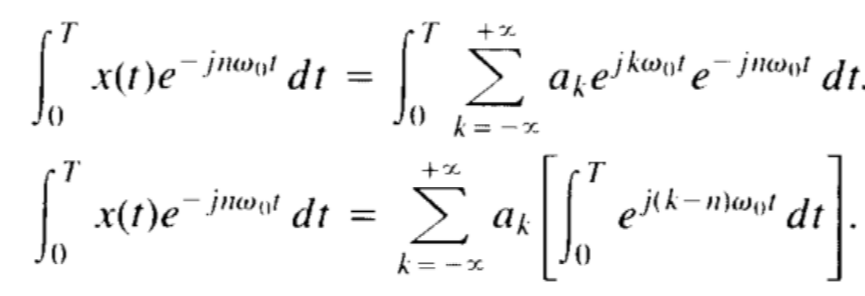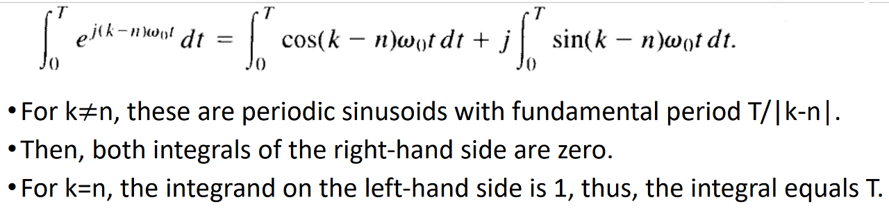 즉 만약 k와 n이 같지 않다면 적분 식 안의 신호는 주기를 가지며 Sin과 Cos으로 표현되는 함수일 것이다.