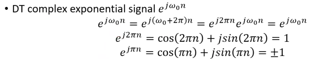 1) DT신호에서는 harmonically related 복소 함수가 w = 유리수 x pi가 되지 않으면, 주기성을 잃는다. DT는 CT의 샘플링 된 관점으로 볼 수 있는데 이 주기 안에 자연수 갯수의 샘플이 딱딱 대칭적인 간격으로 들어가야 주기가 생기기 때문이다. 그래서 w = 유리수 x pi 형태로 한다.