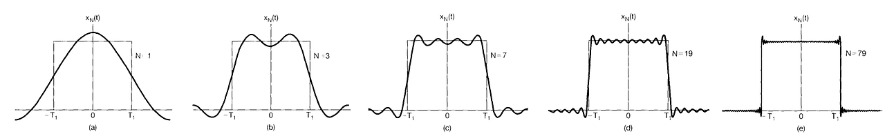 이 때 점점 더 많은 고차항을 추가할 수록 사각파와 비슷하게 '근사'는 되지만, 불연속점 근처에서 진동이 남아있다.