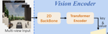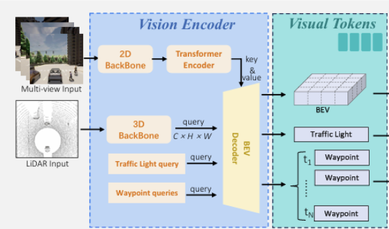 # 요약: BEV 디코더는 트랜스포머 구조를 활용하여 센서 데이터에서 BEV 토큰, 웨이포인트 토큰, 신호등 토큰을 생성. 이 과정에서 H × W 형태의 쿼리를 통해 포인트 클라우드 데이터와 다중 시점 이미지 데이터를 융합하고, 학습 가능한 쿼리를 사용하여 특정 장면 정보를 캡처. 이렇게 생성된 세 가지 유형의 시각 토큰은 LLM에 전달되어 고차원적 의사결정을 지원.