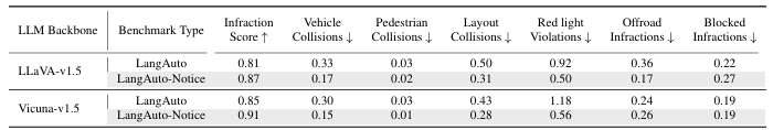 인간 대화 데이터로 미세 조정된 Vicuna-v1.5도 높은 성능을 보이며, 지시 기반 자율주행에서 사전 학습 및 미세 조정의 중요성을 입증. 무작위 초기화된 LLM 모델은 동일한 훈련 데이터를 사용했음에도 성능이 현저히 낮아, 사전 학습된 LLM이 필수적임을 강조(Random_Init)