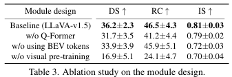 Q-Former, BEV 토큰, 비전 인코더 사전 학습의 유무를 비교하는 소거 실험(ablations)을 수행.