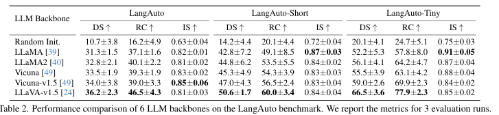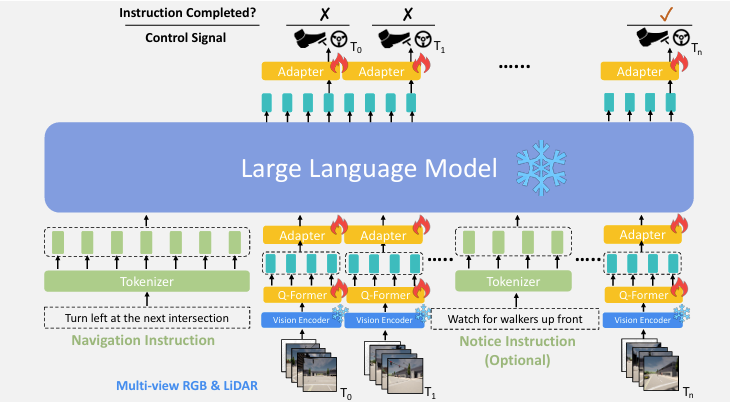 LLM은 전체 주행 절차 동안 '두뇌' 역할을 하며, 동결된 비전 인코더가 생성한 각 프레임의 센서 토큰을 받아 이를 처리하고, 자연어 지시를 이해하며, 필요한 제어 신호를 생성하고, 주어진 지시가 완료되었는지 예측한다. 해당 논문에서는 Language backbone으로 LLaMA를 선택했다.