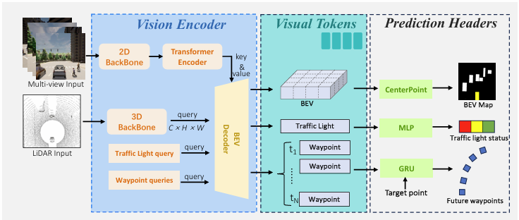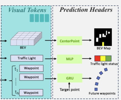 - Waypoint 예측을 위해 N개의 웨이포인트 토큰과 한 개의 네비게이션 웨이포인트(target point)를 순차적으로 입력하여 N개의 future waypoint를 예측하게 된다.