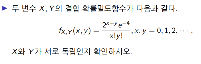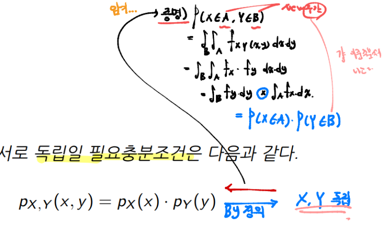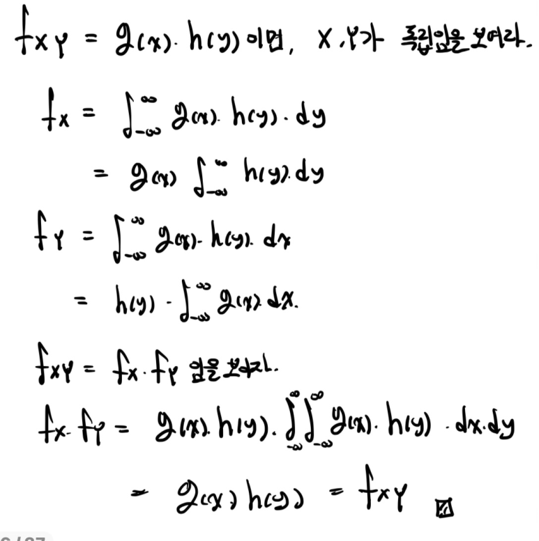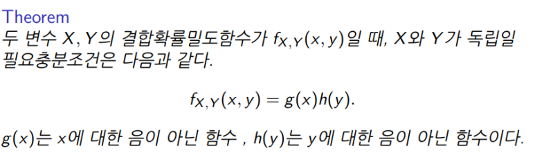 필요 충분 조건. 결합 pdf가 각각의 pdf으로 쪼개지면 X, Y는 독립이다./ X, Y가 독립이면 pdf는 각각으로 쪼개진다.