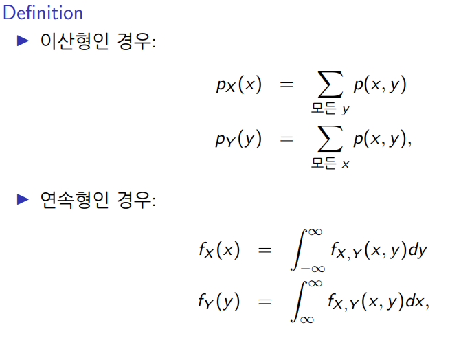 결합 pdf에서 한 확률 변수에 대한 pdf를 뽑아낼 수 있다. 버리고 싶은 확률 변수에 대해 전 구간에 대한 연산을 하면 된다.