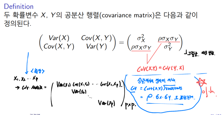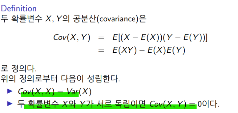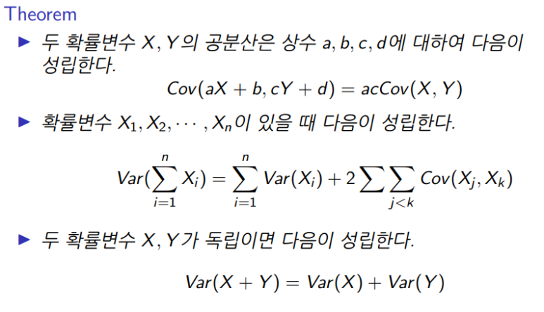 Cov 식, 두 성질 암기.. 두 성질의 증명은 그냥 공분산 정의에 대입해보면 된다.