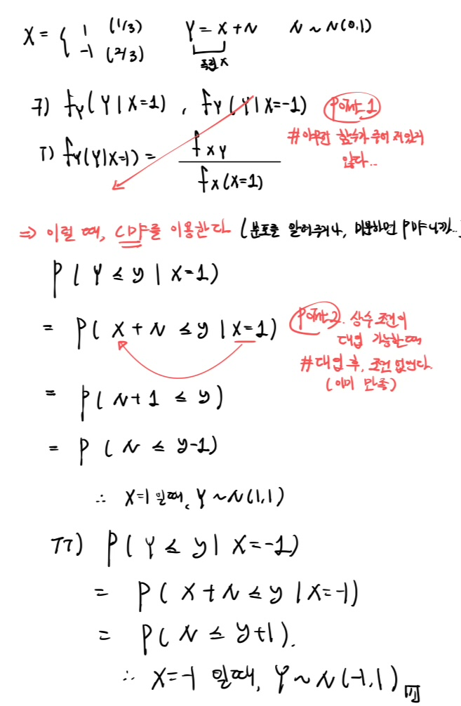 분자에 결합 pdf가 들어가는게 진짜 와닫지 않는다. 꼭 잘 외우고 넘어가자. 알고 싶은걸 함수 아래 적는다. x가 ~일 때 y를 알고 싶으니가 이 조건부 pdf는 fY이다.. 이게 생각보다 헷갈린다..