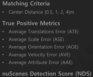 위에서 소개한 자율주행 데이터셋 중 nuScenes 데이터는 다음과 같은 metrix를 사용한다.
