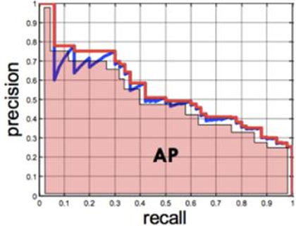 두 지표가 높을 수록 시스템의 성능이 좋음은 자명하다. 하지만 이 두 수치는 trade-off 관계에 있기에 적절한 decision threshold를 통해 이를 조정해나가야만 한다. 이를 고려하는 평가지표를 Average Precision((AP))라고 한다.