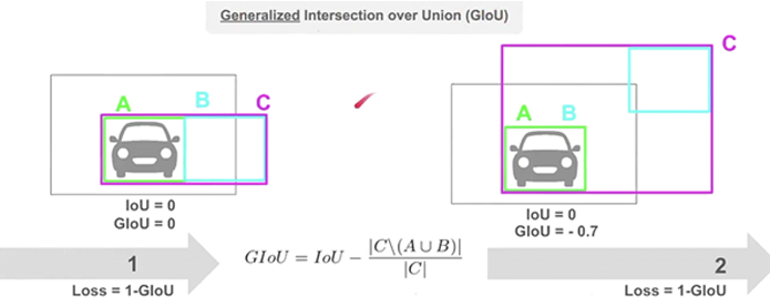 이를 해결하기 위해 Prediction((B)) 과 Ground Truth Box((A))를 모두 포함하는 최소 크기의 Box((C))를 사용하게 된다.