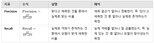 Precision은 물체가 있다고 예측하고 바운딩 박스를 그린 것 중에서 실제로 그 바운딩 박스 안에 물체가 존재하는 확률이다.