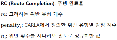 - 기존 점수 체계를 보완하여 주행 거리(Route Completion), 위반 횟수(Number of Infractions), 시나리오 밀도(Scenario Density)를 고려한 가중 점수