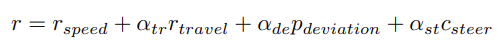 Think2Drive는 안전한 주행과 경로 완수를 유도하기 위해 보상 함수를 구성했다.