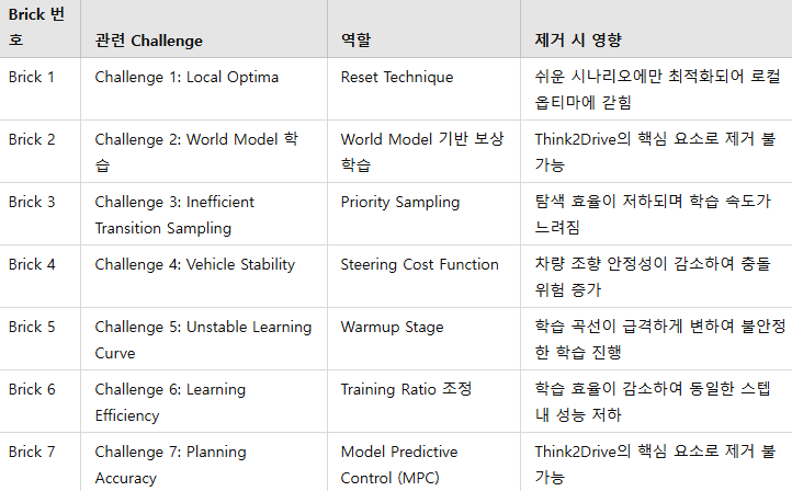 - Resetting Technique, Automated Scenario Generation, Termination-Priority Replay, Steering Cost Function 등의 맞춤형 기법(Bricks) 적용