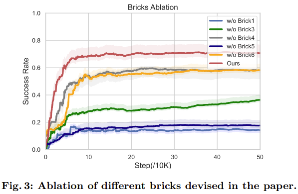3.3에서 설명한 Brick들을 제거해보며 영향을 실험한 결과다. Reset(Brick 1)과 Warmup(Brick 5) 이 가장 중요한 요소로 확인 되었으며, 나머지 Bricks도 학습 속도 및 안정성에 큰 영향을 미친다.