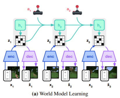 World model이 환경이 어떻게 변하는지 예측하도록 학습된다. 이 학습된 world model을 사용하면 강화 학습이 실제 환경과 직접 상호작용하지 않고도 world model이 만드는 가상의 환경에서 정책을 학습할 수 있다는 거다.