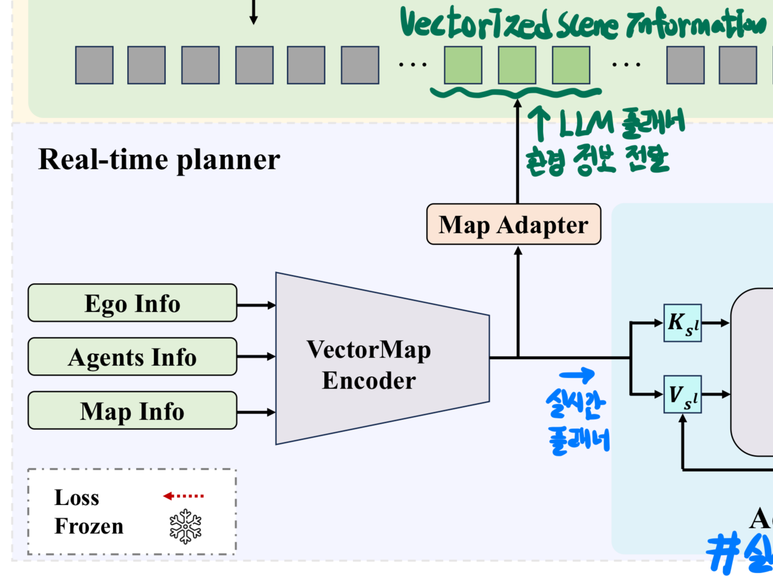 LLM이 추론 속도가 너무 느리니까 보조 역할로만 사용하고 학습 가능한 실시간 플래너를 사용하는데.. 의도대로 제어 가능한 경로를 예측할 것같긴함.