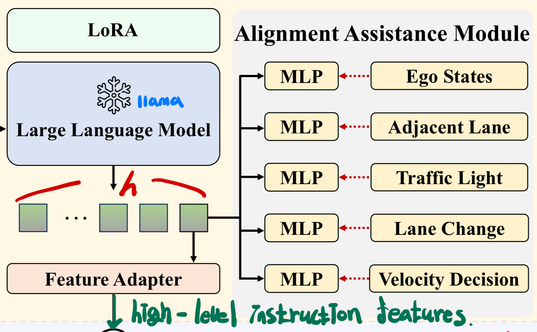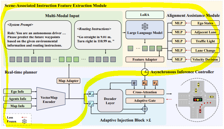 LLM이 routing instructions의 본질을 이해함에 동시에, vectorized scene information를 세밀하게 분석하여 최종 scene-associated high-level instruction features 추출을 강화하기 위해 Alignment Assistance Module를 사용한다.
