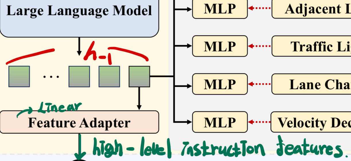 여기서 중요한건 h는 경로 자체가 아니다. LLM이 환경 정보와 자연어 데이터를 받아 뽑은 중요한 Feature인 것이다. 이걸 이제 실시간 플래너에 전달하여 플래닝 성능을 올린다.